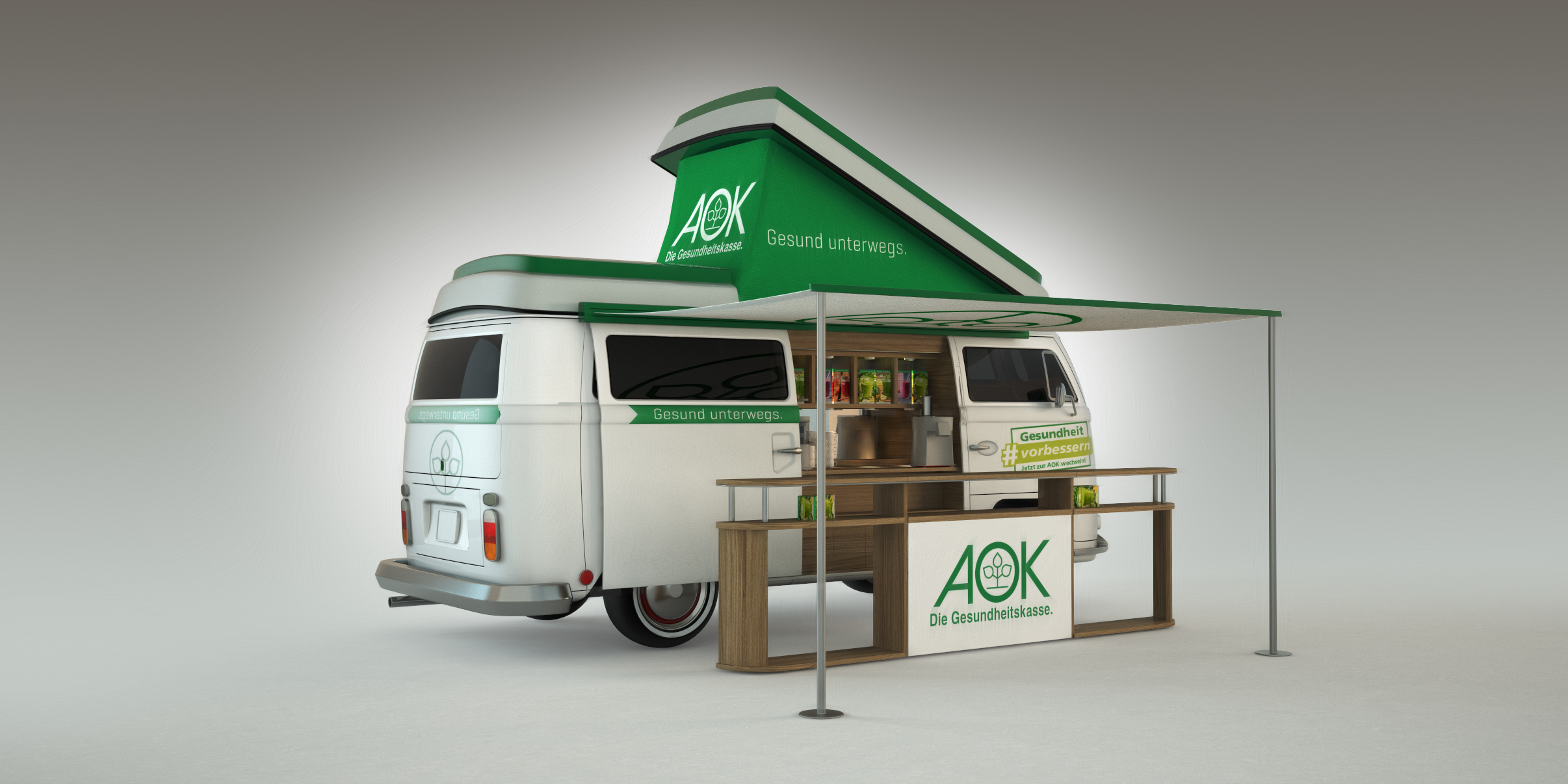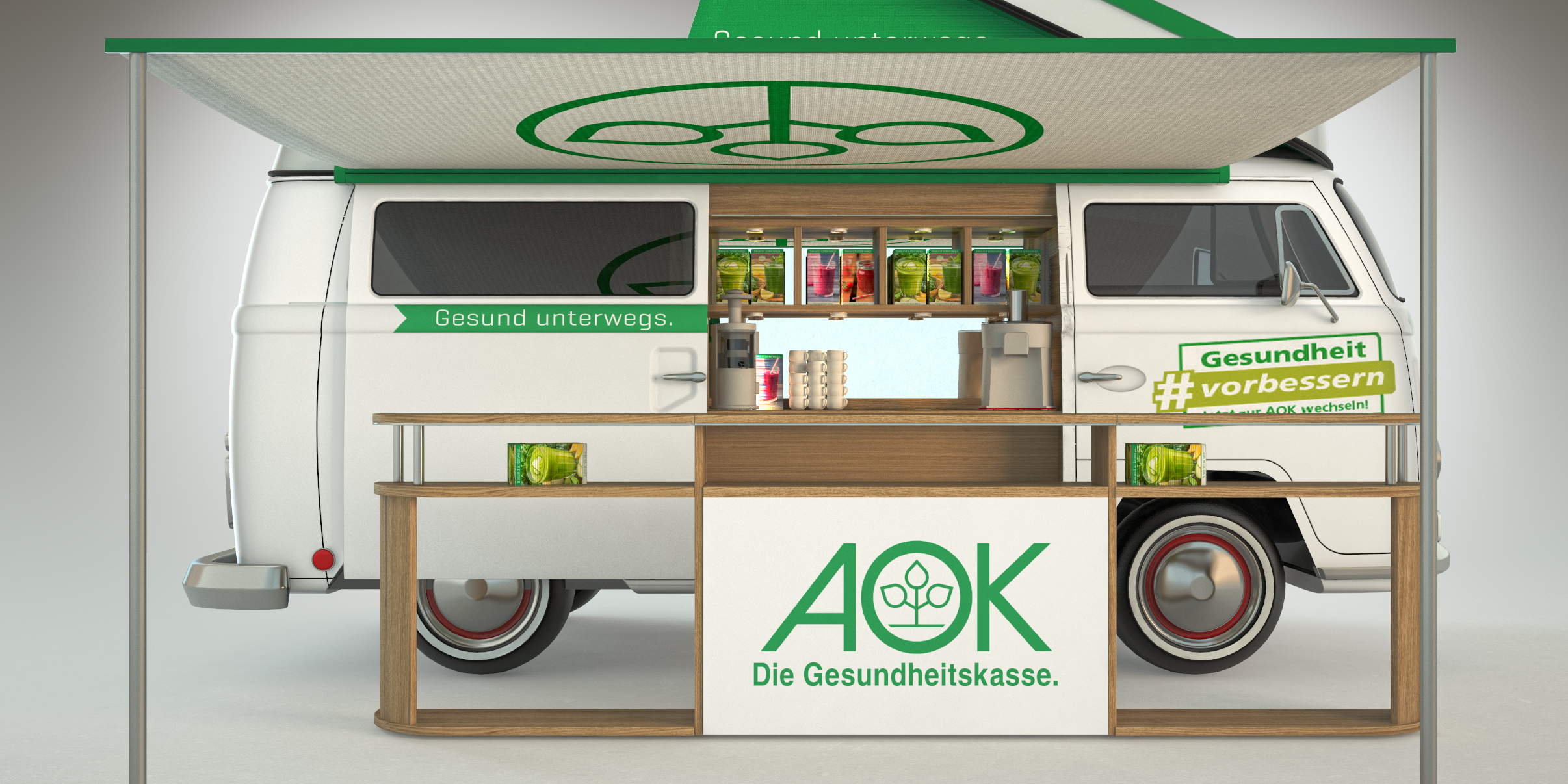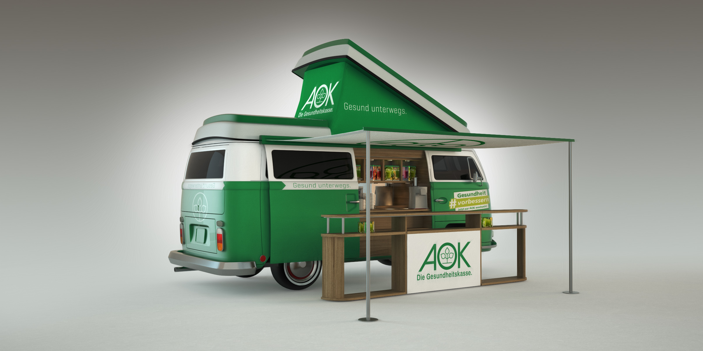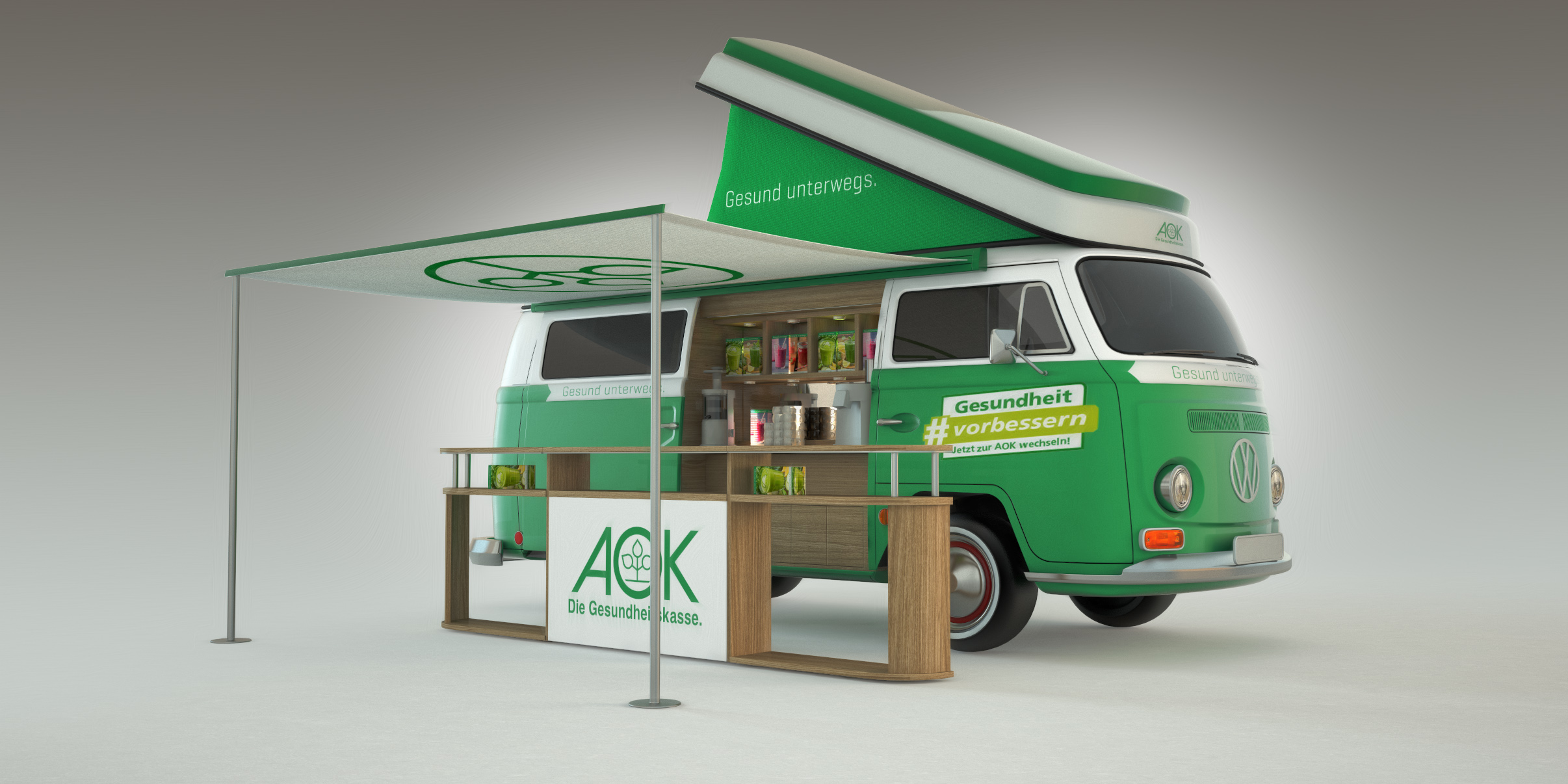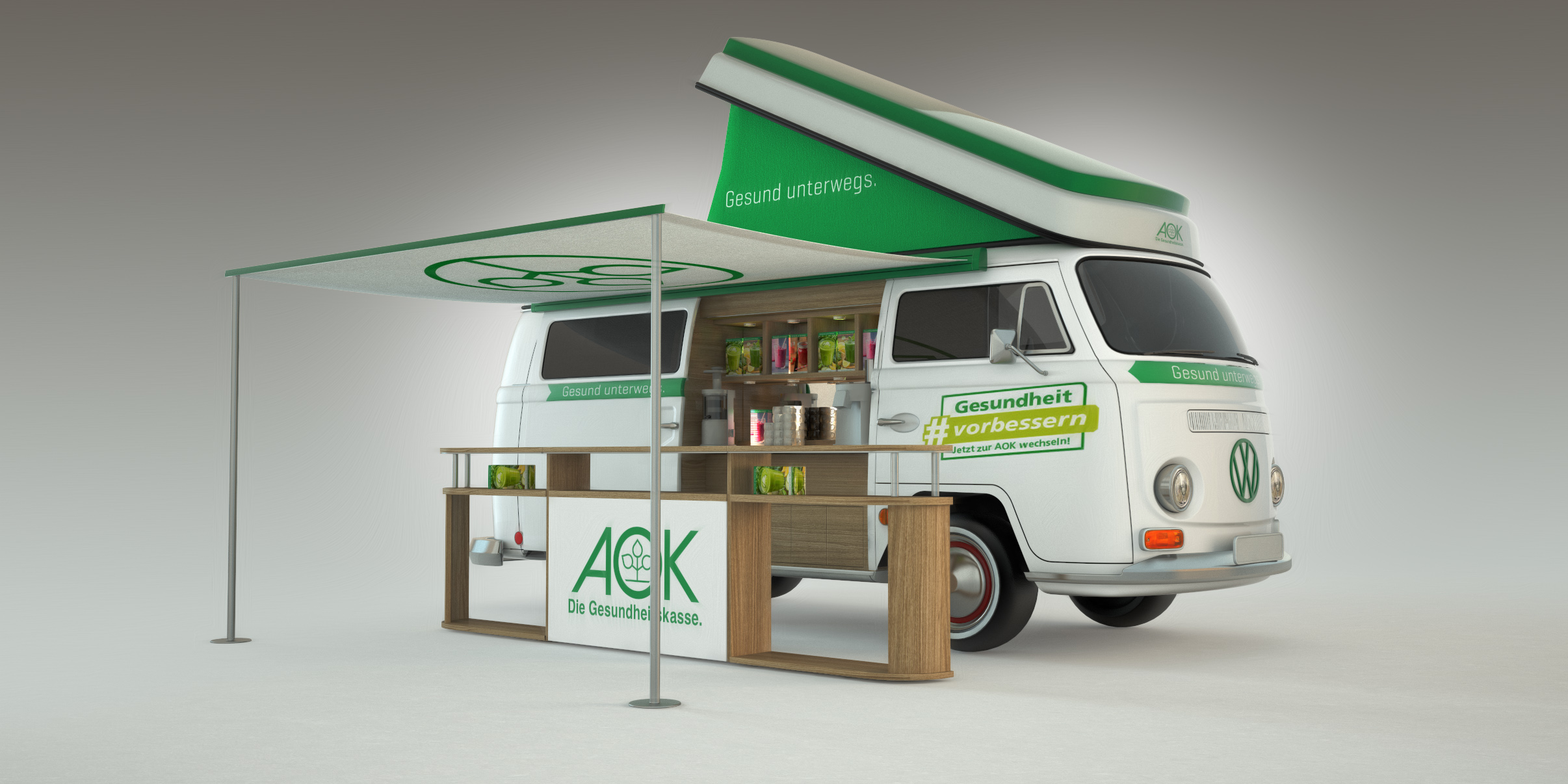 Das Briefing = Ein etwas anderes Promotionfahrzeug. Ein Blickfang, der nicht zu übertrieben ist und dennoch die AOK wirkungsvoll repräsentiert. Bei all den Reizen, denen wir täglich begegnen und die „HIER“ schreien, wirkt der VW T2 Bulli mit seiner mehr als 50-jährigen Geschichte wie eine Konstante der Stabilität in einer schnelllebigen Welt. Er ist außergewöhnlich und erscheint zugleich sehr vertraut. Die AOK vereint all diese Eigenschaften – und so stimmt die Chemie in dieser Beziehung einfach.